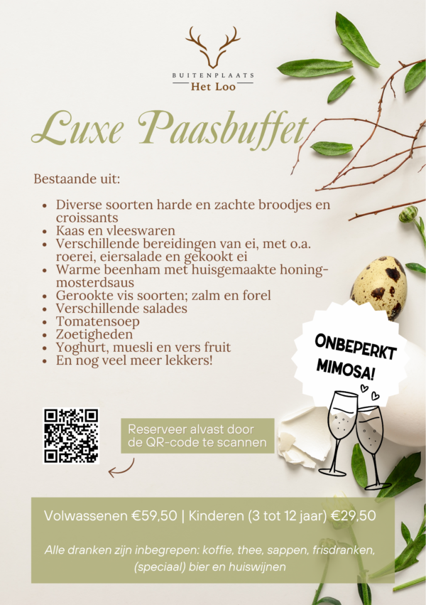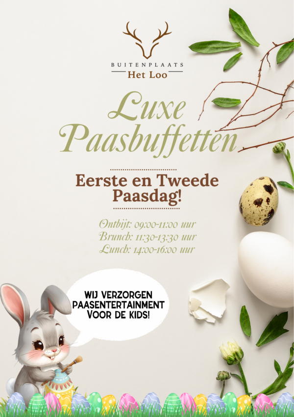 Op Eerste en Tweede Paasdag verwelkomen wij u graag bij Buitenplaats Het Loo voor onze luxe Paasbuffetten. Geniet samen van een uitgebreid buffet met heerlijke warme en koude gerechten, versgebakken broodjes en feestelijke zoetigheden. Alle dranken zijn inbegrepen, zodat u onbezorgd kunt genieten.